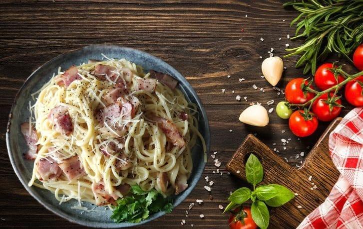 Состав: спагетти, бекон, сливки, сыр, соль, перец черный молотый Объем 350 гр