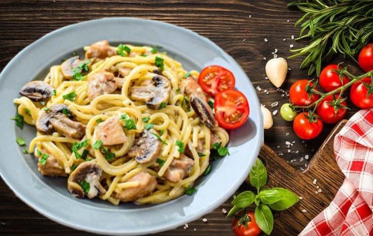 Состав: спагетти, шампиньоны, курица, помидоры черри, сливочный соус, сыр, соль, перец черный молотый Объем 350 гр